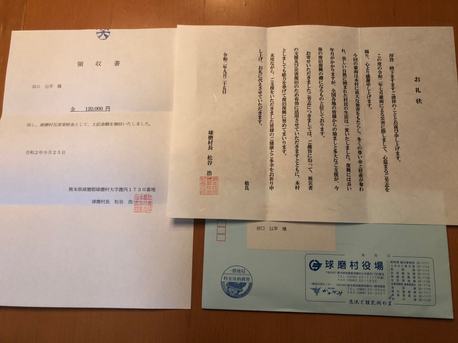 台風10号の影響は、幸い、あまりなかったようですが、球磨村役場の方からもお話を伺い、コロナの感染拡大リスクを考え、判断いたしました。義援金は、あまり遅くならないよう、明日にでも口座振り込みでお届けするとともに、メールにて皆様のお名前、メッセージを球磨村にお送りしたいと思います。義援金を寄託していただいた皆様には直接お届けすることが出来ず、大変申し訳ありませんが、被災地でいまだ大変な生活を強いられている球磨村の皆様のことを考えると、若干でも不安の残る